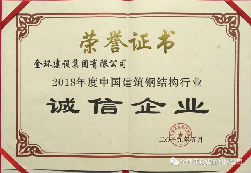 【金環(huán)捷報(bào)】熱烈祝賀金環(huán)建設(shè)集團(tuán)有限公司被中國(guó)建筑金屬結(jié)構(gòu)協(xié)會(huì)評(píng)為2018年度中國(guó)建筑鋼結(jié)構(gòu)行業(yè)“五十強(qiáng)企業(yè)”、“誠(chéng)信企業(yè)”
