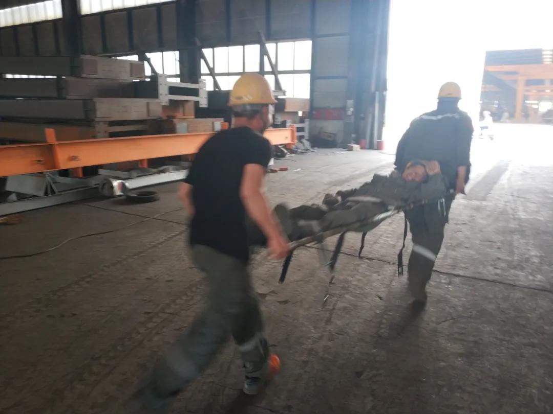 第二步:相關(guān)區(qū)域作業(yè)人員及時(shí)起吊構(gòu)件,將傷者轉(zhuǎn)移到安全區(qū)域;及時(shí)撥打120,并上報(bào)車(chē)間主任和相關(guān)負(fù)責(zé)人;