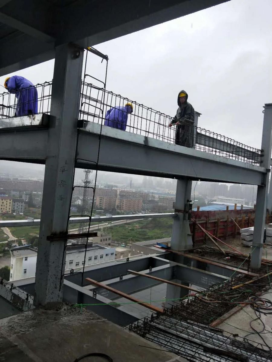 在施工現(xiàn)場,項目部制定了合理的施工計劃和安排,為了搶占工期,項目部在春節(jié)前調(diào)撥40名工人,保證春節(jié)前地基及基礎(chǔ)工程全部完成。鋼結(jié)構(gòu)吊裝分三班倒,六個班組24小時不停工。針對雨水對施工的影響,項目部進(jìn)行了有效的分工和安排。工人們積極行動起來,戴雨衣穿雨鞋堅持在施工一線,發(fā)揚(yáng)不畏困難、敢于拼搏的金環(huán)精神。