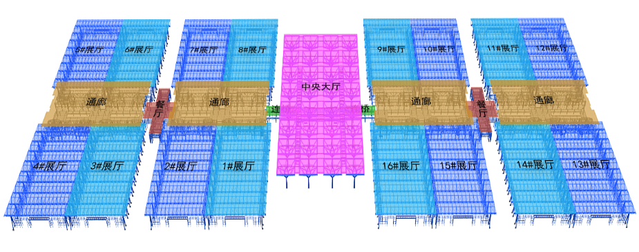▼ 交通連廊主要是由屋蓋和內(nèi)部附屬結(jié)構(gòu)組成,內(nèi)部附屬結(jié)構(gòu)為兩層或三層鋼構(gòu)件結(jié)構(gòu)。