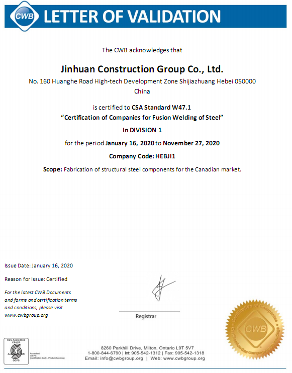 除美標AISC認證以外,金環(huán)建設(shè)集團還連續(xù)多年通過了加拿大焊接協(xié)會CWB認證、歐盟EN 1090認證,成為國內(nèi)極少數(shù)同時擁有這三大國際鋼結(jié)構(gòu)產(chǎn)品管理體系認證的企業(yè),代表了金環(huán)通過了全球最具權(quán)威的鋼結(jié)構(gòu)產(chǎn)品管理體系的認證,擁有了通往歐美高端鋼結(jié)構(gòu)市場的“通行證”。