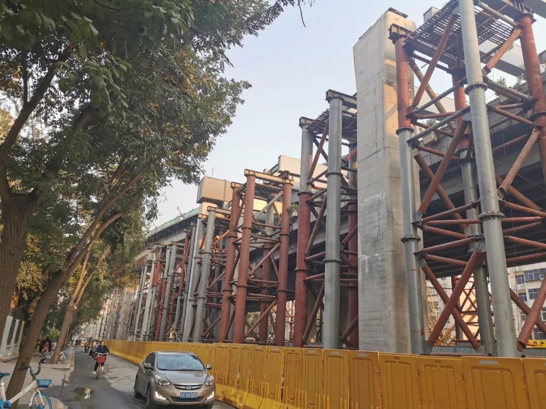 ▼槐安路橋段施工南側(cè)緊鄰路旁大樹和高壓線