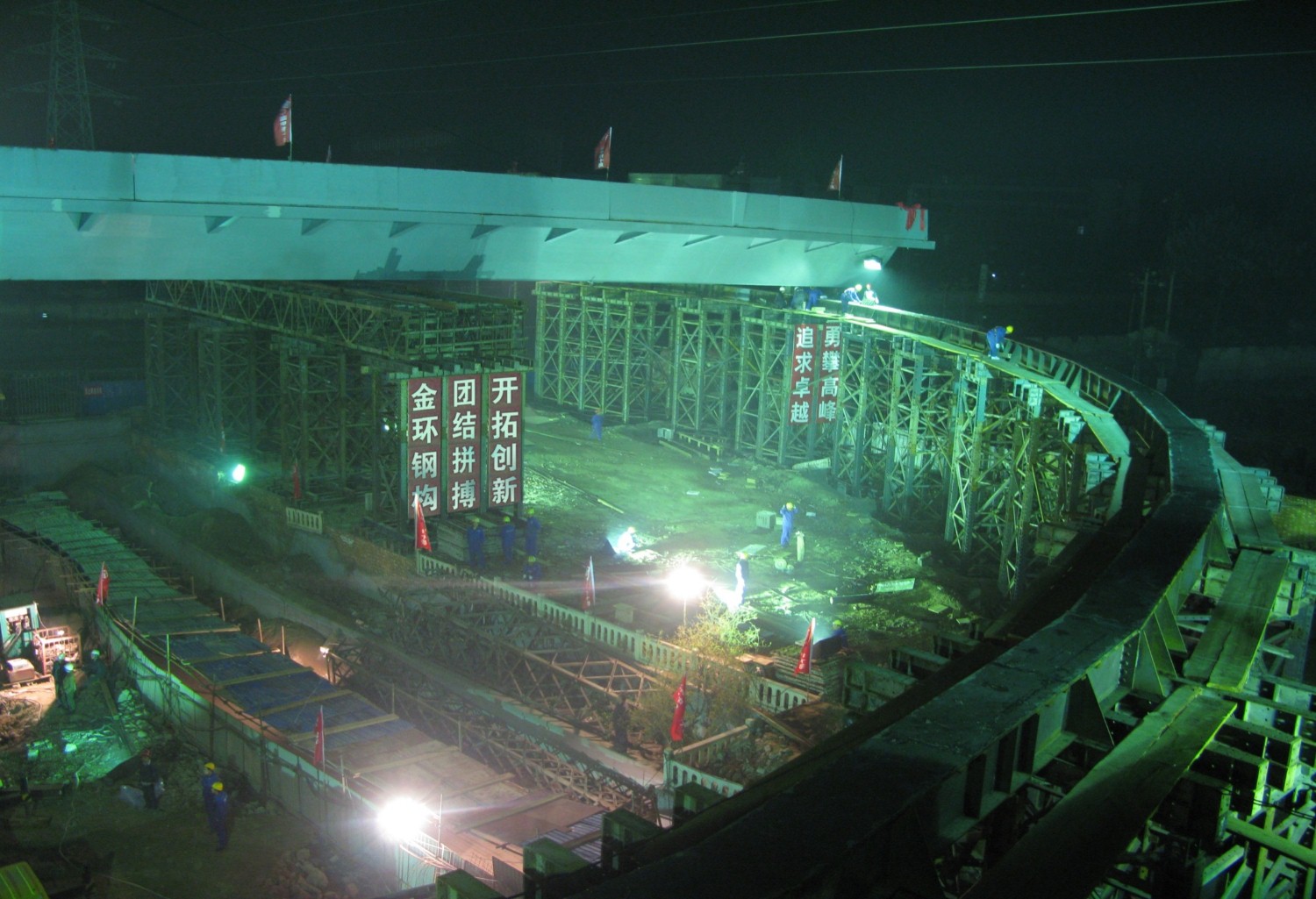 位于石家莊市和平路,跨越京廣鐵路線; 采用兩跨鋼結(jié)構(gòu)連續(xù)鋼箱梁,橋梁總長(zhǎng)度為128.452m;橋梁結(jié)構(gòu)設(shè)計(jì)為單箱多室鋼箱梁,單箱頂寬為25.5m,橋梁水平投影線形為800米半徑圓弧+緩和曲線+直線段;橋面橫坡自單向坡3%變化至雙向坡1.5%;采取順鐵路方向拼裝后,整體平轉(zhuǎn)的方式施工,在1小時(shí)內(nèi)完成轉(zhuǎn)體工作。