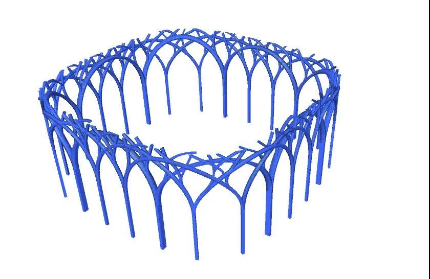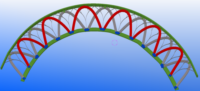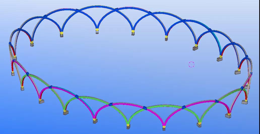 這三個構(gòu)件均為復(fù)雜空間曲線,為我們的制造安裝工作帶來了極大的挑戰(zhàn)和困難。技術(shù)部門集中精英力量,經(jīng)過多次線型計(jì)算及在TEKLA軟件中模擬線型建出桿件,并綜合車間制作和現(xiàn)場安裝各方面實(shí)施的可能性,選出最優(yōu)的方案,進(jìn)行加工制作。
