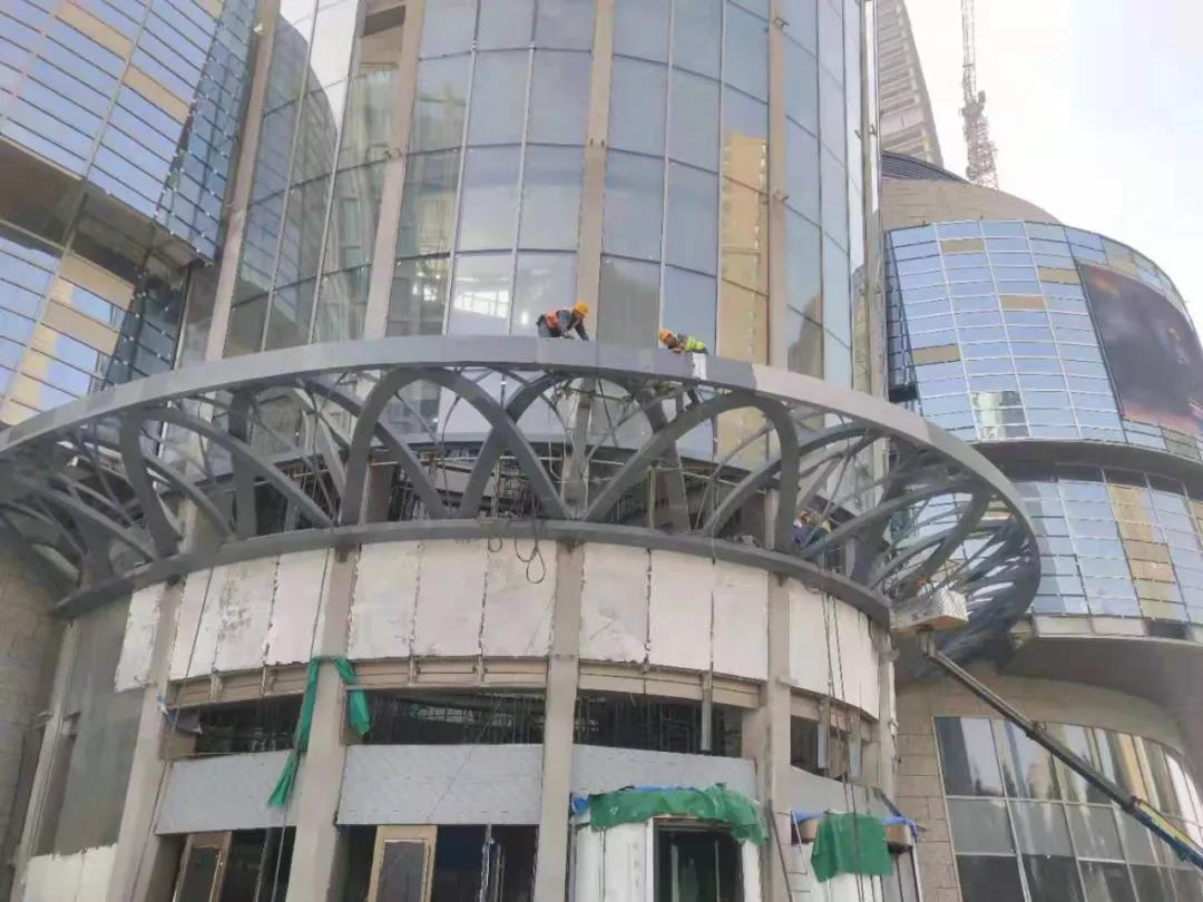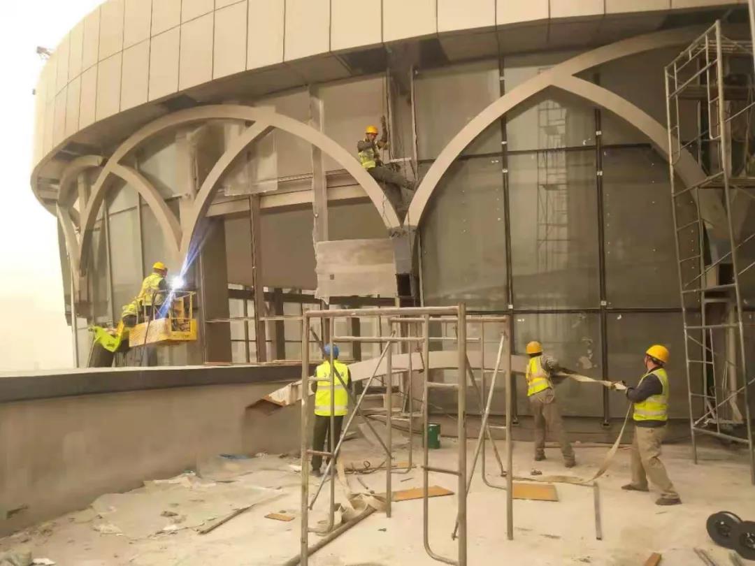 三個單體均為原有構(gòu)件的外圍裝飾性構(gòu)件,由于內(nèi)部構(gòu)件已經(jīng)完成,加大了我們的吊裝難度及現(xiàn)場焊接的難度。高空作業(yè),空間狹小,對我們安裝是極大的考驗(yàn)?,F(xiàn)場安裝人員通過提前規(guī)劃安裝作業(yè)方案,制定吊裝策略方案,克服種種困難,使得現(xiàn)場的安裝工作有序完成。