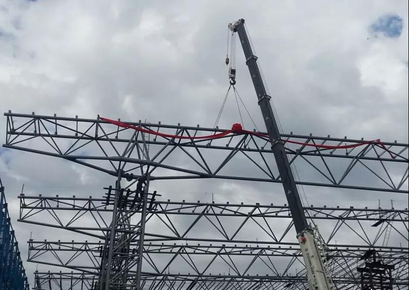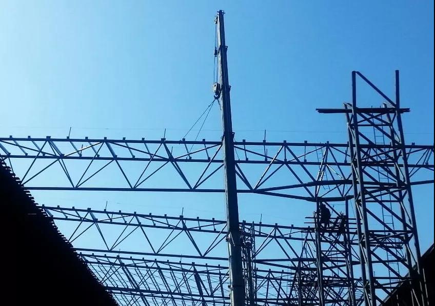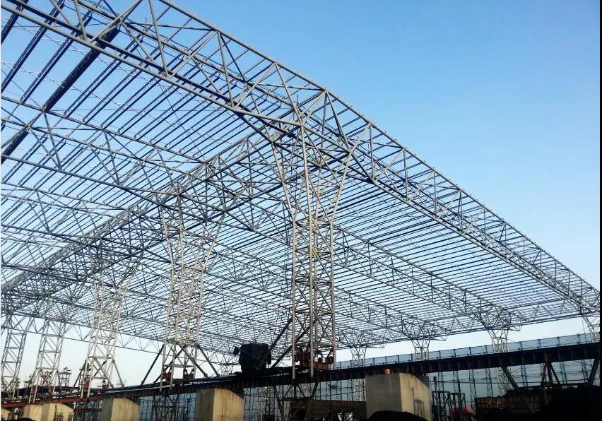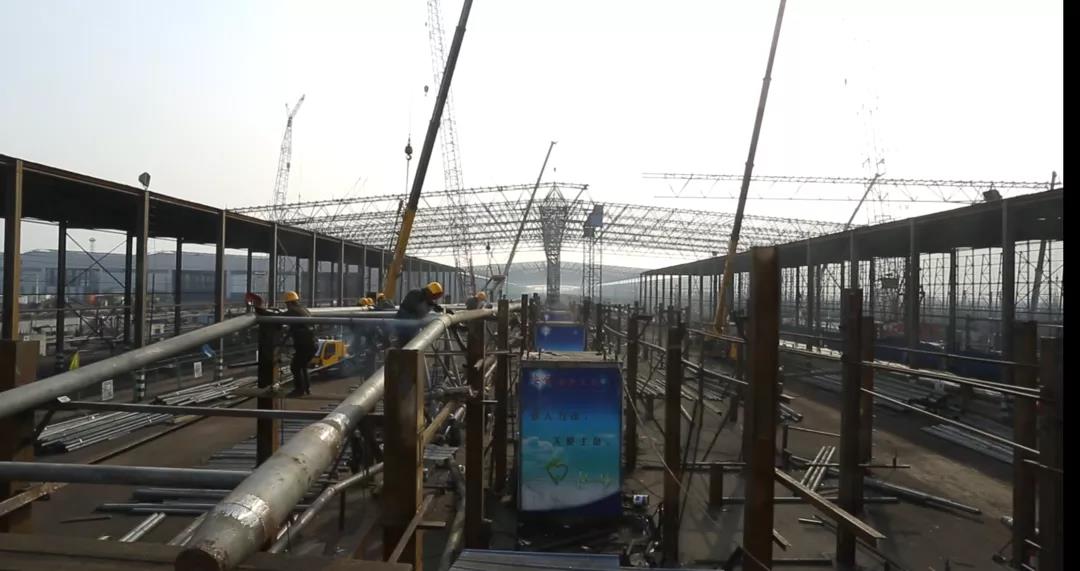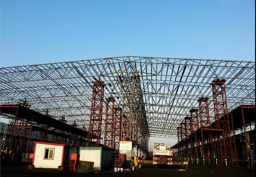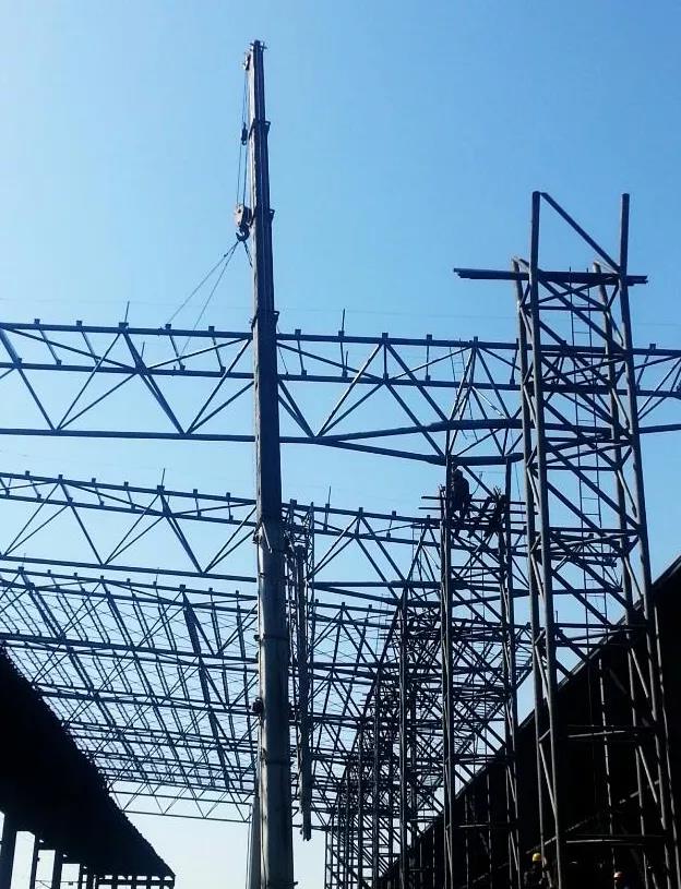 鋼結構長1660米,寬123米,用鋼量8316噸,其中屋蓋桁架及下部支撐柱6109噸,屋面檁條1891噸鋼結構現(xiàn)場地面拼接,在工期時間僅有4個月的情況下,工程任務非常大。
