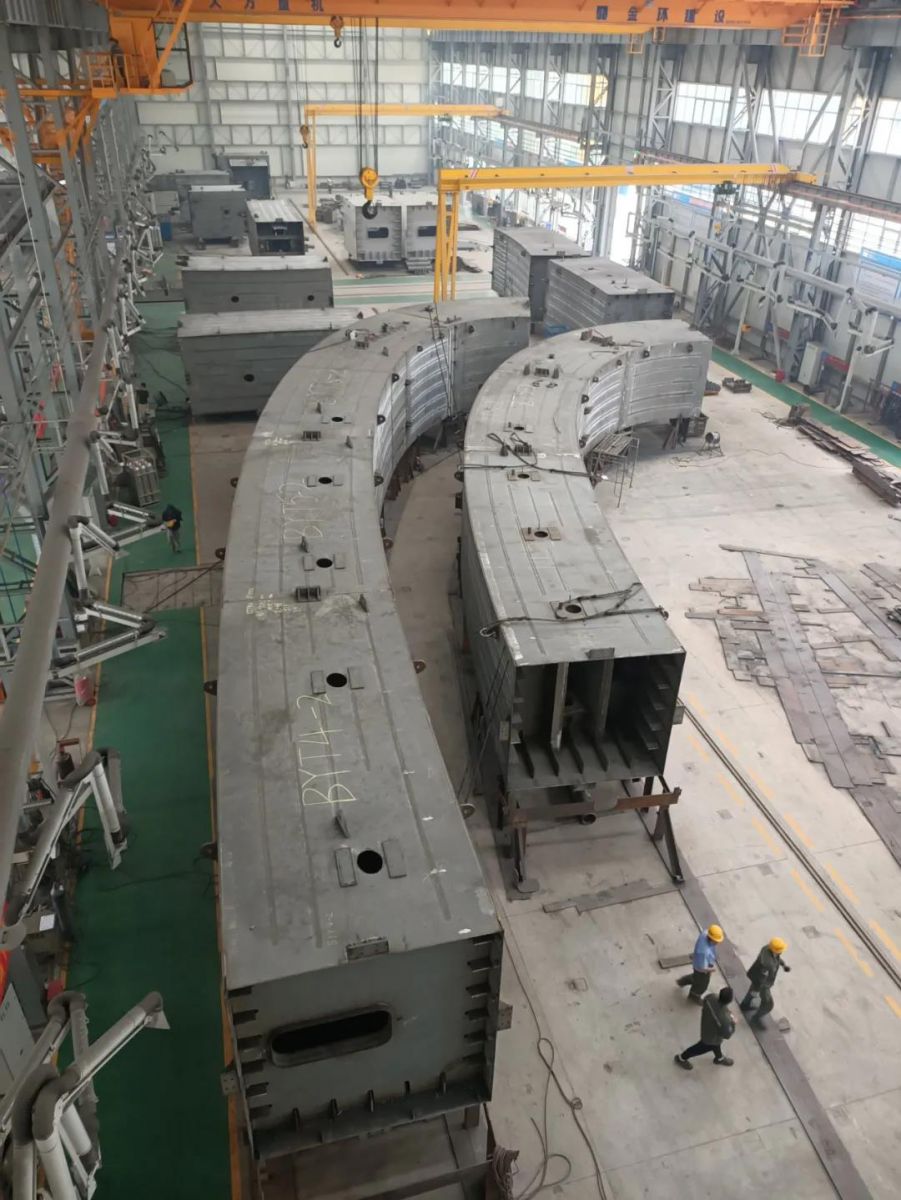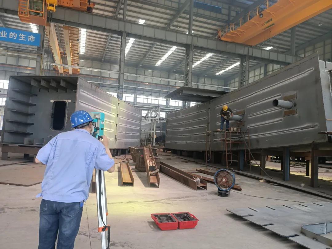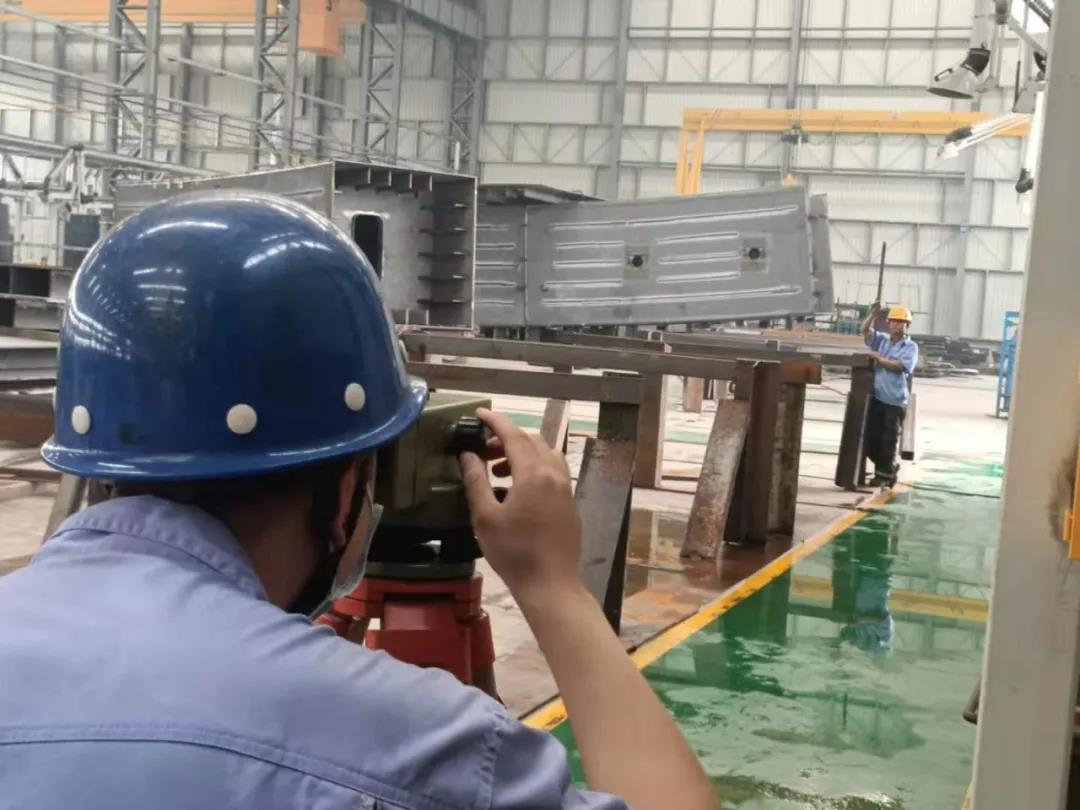 1。鋼塔線形精度控制難度高。鋼塔為半橢圓弧形橋塔,涉及非常多的不規(guī)則曲面,在分段制作中,每個分段的截面和弧度都不一樣,需要嚴(yán)格控制每一段的加工精度,已實現(xiàn)最終的完美合龍。金環(huán)建設(shè)集團技術(shù)部和詳圖部制定了詳細(xì)的加工計劃和制作工藝流程,制造人員和檢驗人員全程使用全站儀監(jiān)測鋼塔定位控制點,高精度確保鋼塔制作段定位,并現(xiàn)場復(fù)原工廠測量數(shù)據(jù),確保鋼塔順利合龍;