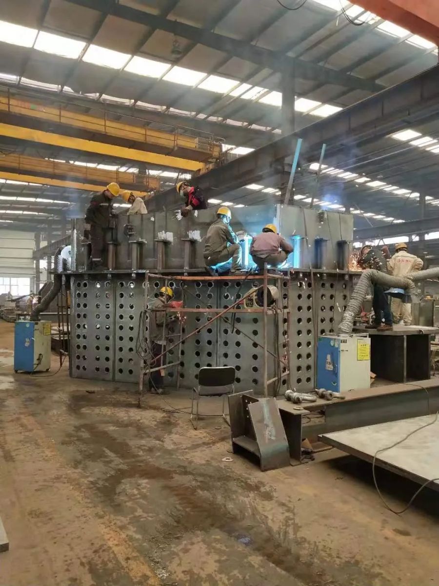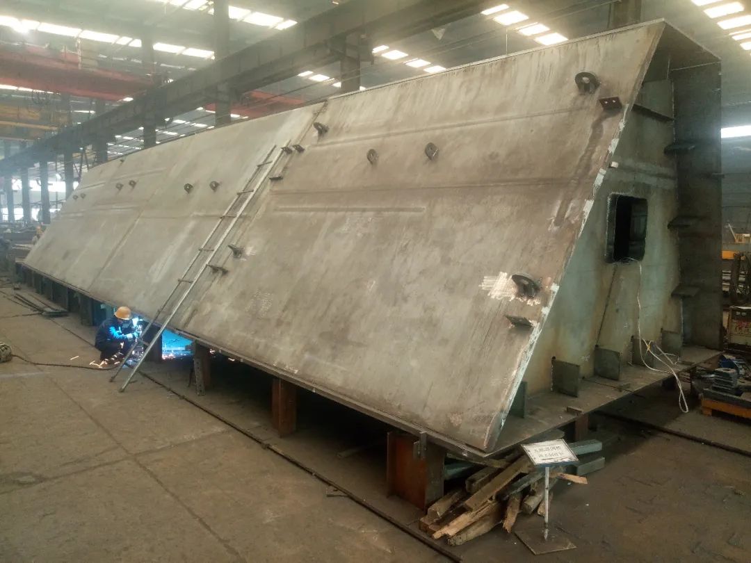 1、鋼塔節(jié)段采用厚板單箱室結構,焊縫密集、焊接量很大,且結構組裝精度控制難度大、穩(wěn)定性差,焊接變形控制難度非常大。因此,鋼塔厚板焊接質量及焊接變形控制是制作難點和關鍵點,生產(chǎn)效率也面臨極大挑戰(zhàn)。