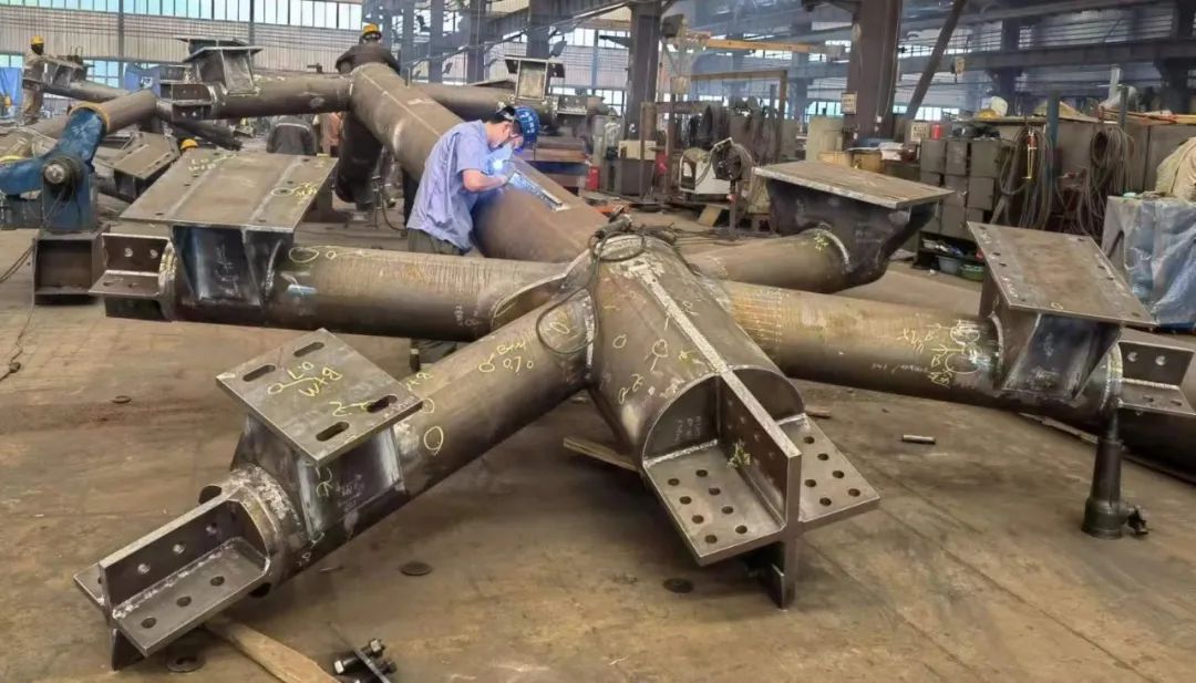 可以說,金環(huán)承接的這部分管桁架網(wǎng)狀鋼結(jié)構(gòu),是整個籃球館所用鋼結(jié)構(gòu)中生產(chǎn)加工難度最大的部分,它兼具了曲面造型&節(jié)點(diǎn)復(fù)雜、外露鋼結(jié)構(gòu)級別高、厚壁焊接等難點(diǎn),同時(shí)全程接受監(jiān)理的過程監(jiān)督和檢驗(yàn),為生產(chǎn)加工工作帶來了極大的挑戰(zhàn)。