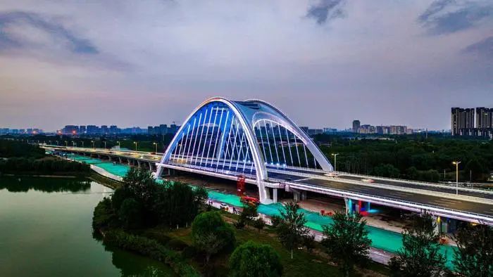 泊水公園特大橋已經(jīng)成為復興大街上一道亮麗的風景線。高達48米的環(huán)形橋拱立于環(huán)城水系碧綠的河面之上,周邊繁盛的樹木郁郁蔥蔥。夜里大橋上燈光秀亮起,色彩斑斕,光彩奪目,成為復興大街上一個標志性的景觀。(項目更多信息請戳→金環(huán)承建 | 復興大街泊水公園特大橋通車在即!)