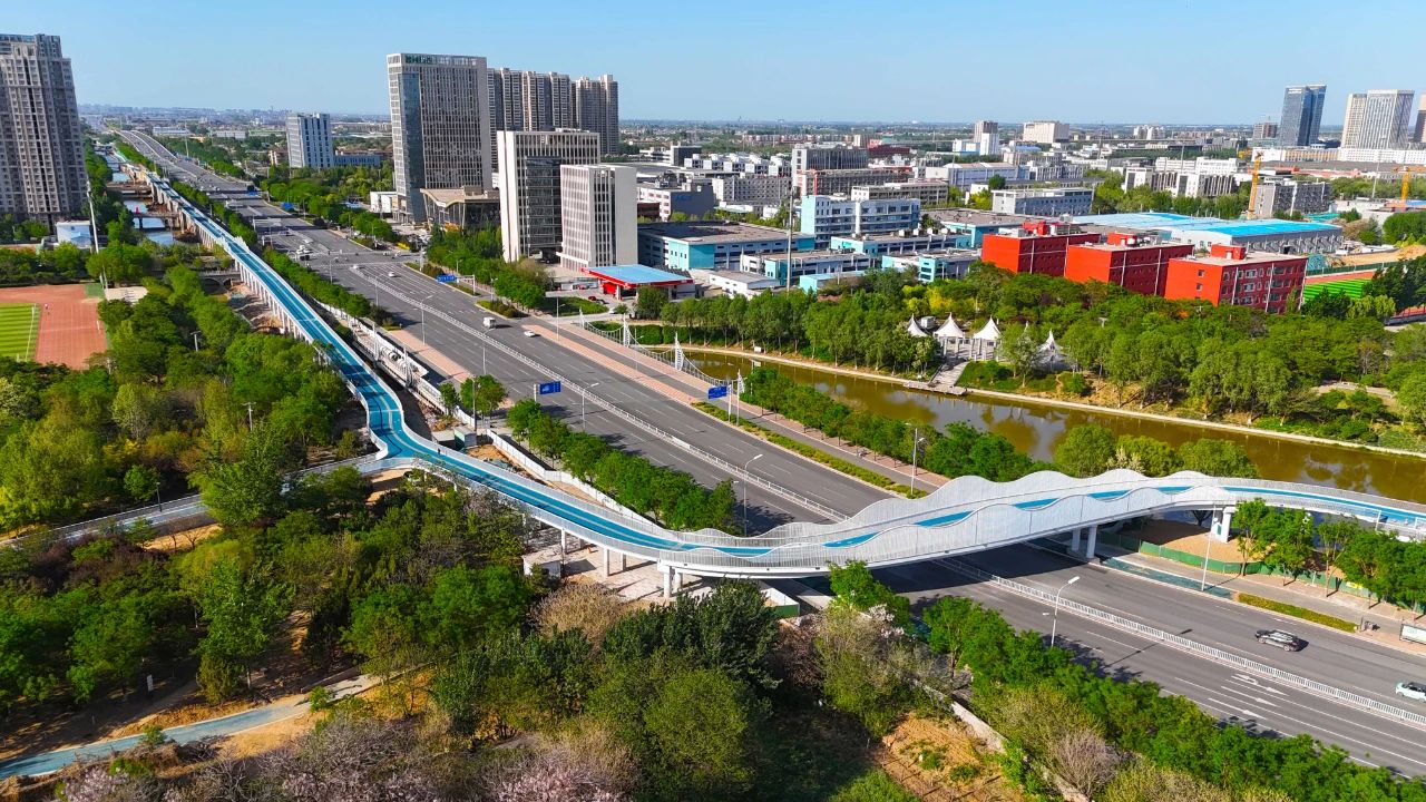 這座由金環(huán)鋼結(jié)構(gòu)參與建設(shè)的石家莊環(huán)城綠道,臨河而建、遇水搭橋,橫跨道路、蜿蜒飄逸,穿梭于城市道路和公園美景之間,仿佛一條綠色絲帶飄落在城市中間。