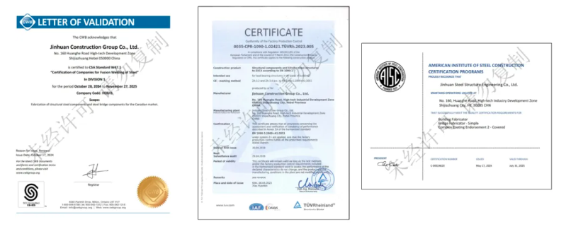 金環(huán)擁有包括建筑工程施工總承包一級(jí)資質(zhì)、鋼結(jié)構(gòu)工程專業(yè)承包一級(jí)資質(zhì)在內(nèi)的多項(xiàng)國(guó)內(nèi)資質(zhì),以及美國(guó)鋼結(jié)構(gòu)協(xié)會(huì)AISC認(rèn)證、加拿大焊接協(xié)會(huì)CWB認(rèn)證和歐盟EN 1090認(rèn)證等多項(xiàng)國(guó)際認(rèn)證
