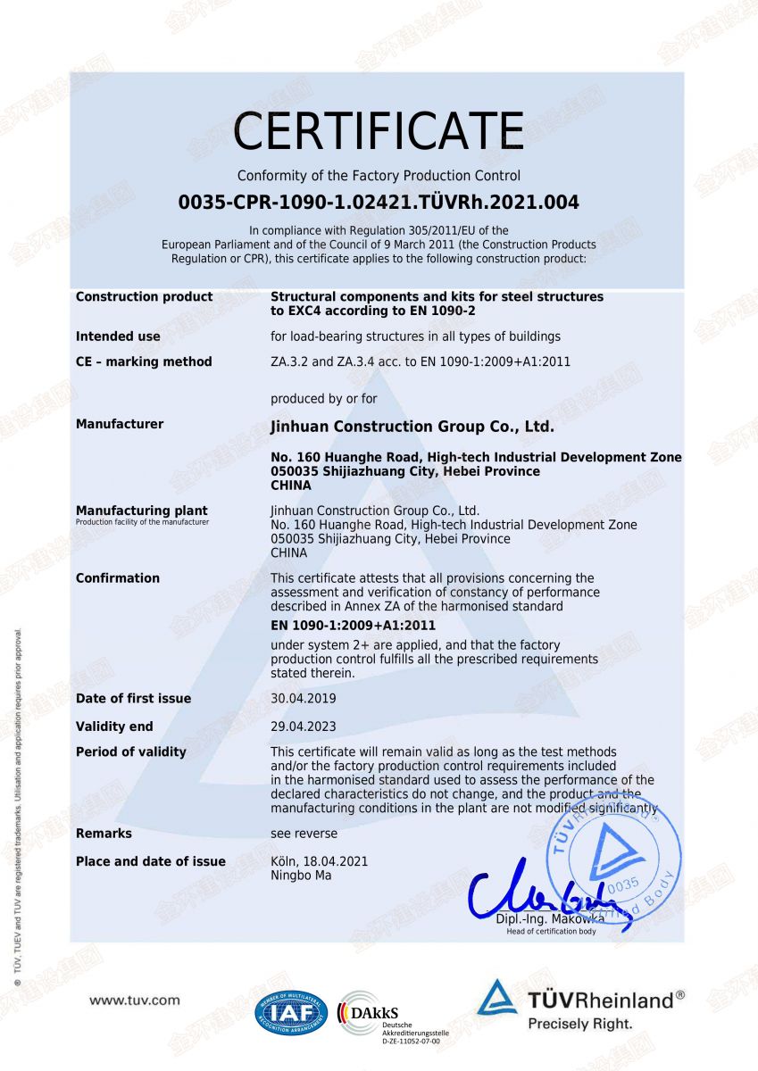 金環(huán)建設(shè)集團擁有建筑工程施工總承包一級資質(zhì)、鋼結(jié)構(gòu)工程專業(yè)承包一級資質(zhì)、輕型鋼結(jié)構(gòu)工程設(shè)計專項甲級、中國鋼結(jié)構(gòu)制造特級企業(yè)資質(zhì)等多項資質(zhì)認證,并且通過了ISO 9001質(zhì)量管理體系、環(huán)境管理體系和職業(yè)健康管理體系認證,同時獲得美國鋼結(jié)構(gòu)協(xié)會AISC認證,加拿大焊接協(xié)會CWB以及歐盟EN 1090和歐盟EN 3834等多項國際認證。